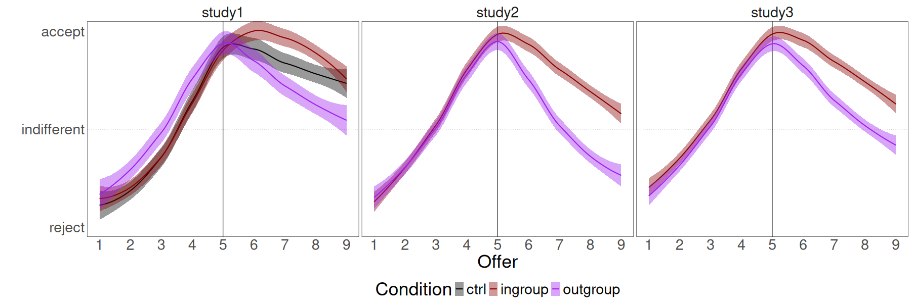 In the plot above, you can see data from Biella & Sacchi (2018). People had to decide whether to accept or reject a proposal on the behalf of a receiver in multiple rounds of the Ultimatum Game.