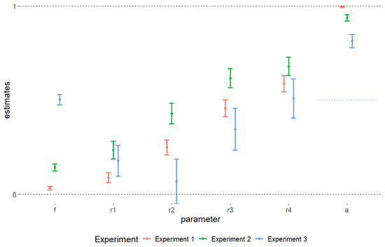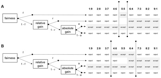 Three processes govern the decision. Fairness (f), relative gain maximization (r1, r2, r3, r4), and absolute gain maximization (a). All processes lead to theoretically determined predictions, they are all active simultaneously, and each parameter is estimated using Multinomial Processing Trees (MPT) models.