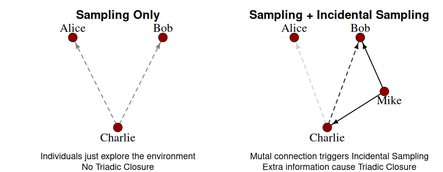 In the left side of the picture, Charlie, our focal agent, deosn't know Alice or Bob. If Charlie has to explore the explore the social environment by sampling alone, he is equally likely to become friend with Alice or Bob.